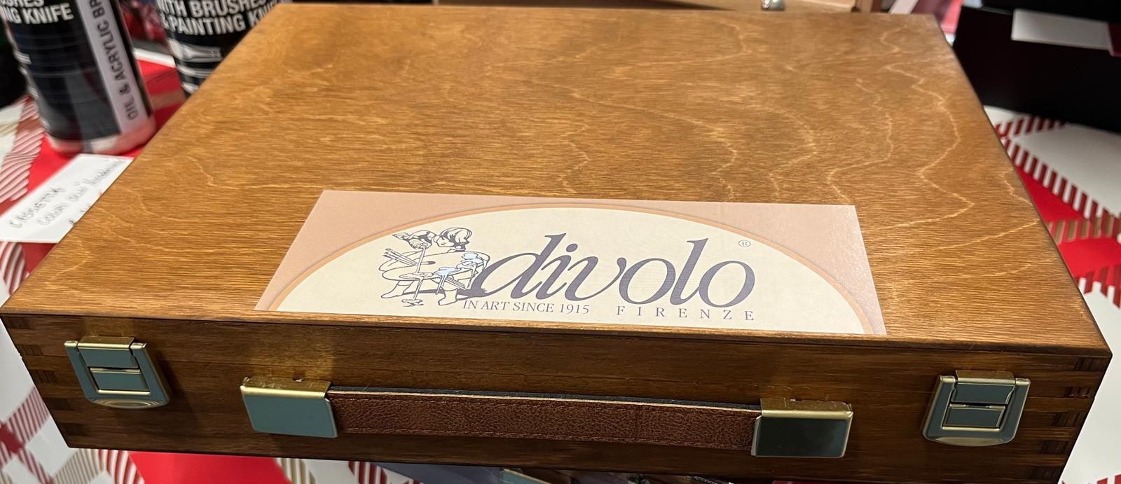 Cassetta in legno con tavolozza, contenente 12 tubetti da 20 ml di colore ad olio, 1 tubo Bianco da 60 ml, 2 ausiliari per pittura, 1 confezione di fusaggine, 1 scodellino doppio, 1 pennello.