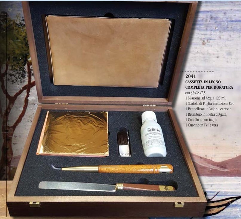 Cofanetto in legno, ideale per il doratore. Contiene 1 cuscino in pelle naturale, 1 coltello per tagliare la foglia oro, 1 libretto di foglietti in similoro, 1 brunitoio in pietra d’agata, 1 pennello in Vajo su cartoncino, 1 missione ad acqua da 125 ml. misura del cofanetto cm 33x 28 x7,5.