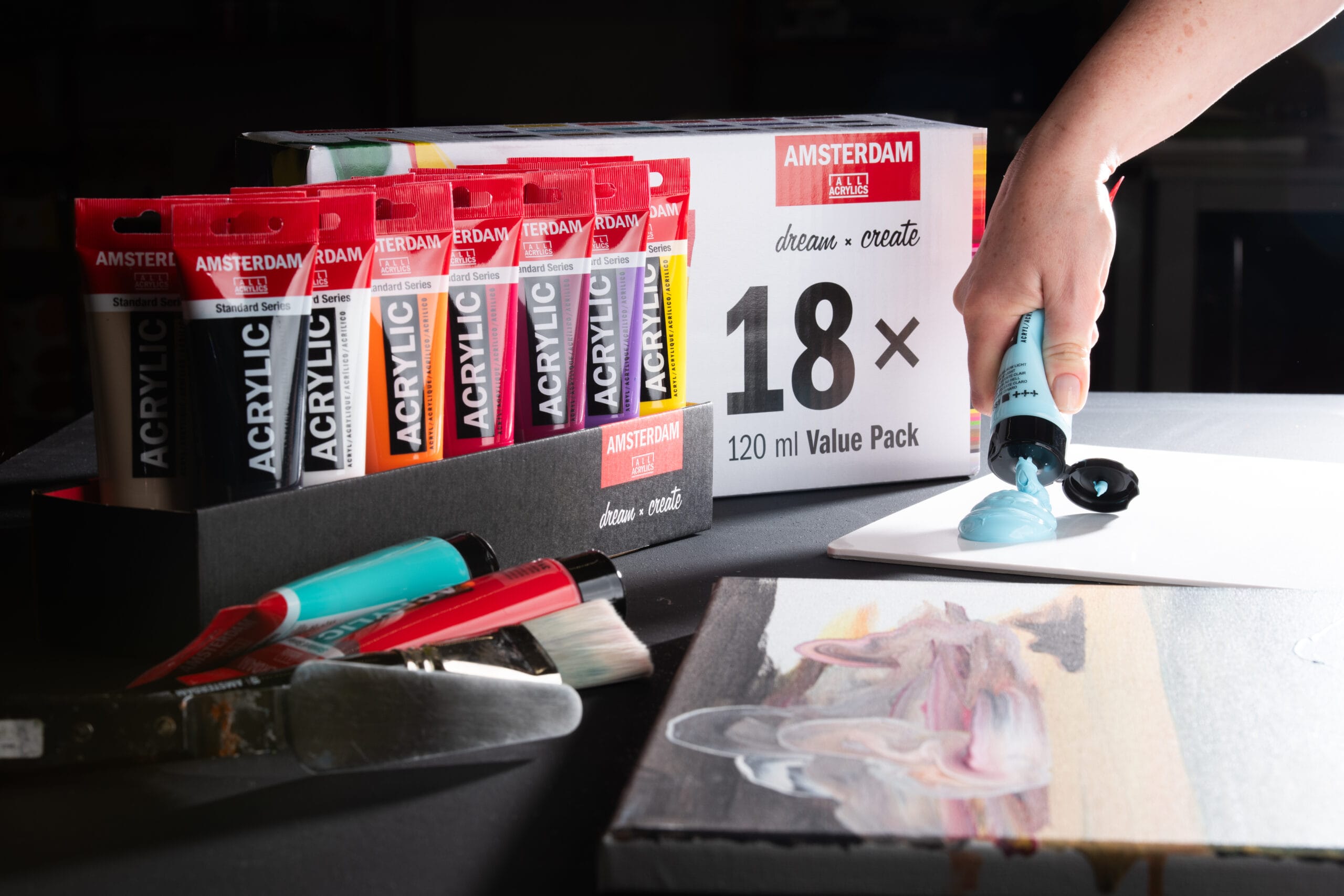 Confezione in cartone con 18 colori acrilici in tubo da 120 ml linea Acrylic Amsterdam Royal Talens.